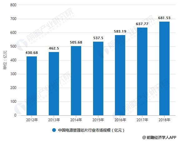 在国内市场上,根据工业和信息化部下属企业——赛迪顾问统计数据显示,2012-2018年,行业市场规模从430.68亿元增长至681.53亿元,其年复合增速达7.95%,行业整体保持着稳定增长的状态。截至2018年,中国电源管理芯片行业市场规模达681.53亿元。