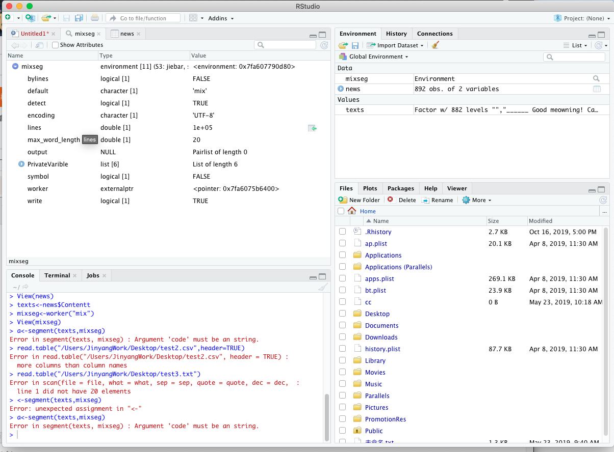 RStudio想要做分词词运,使用segment出现问题