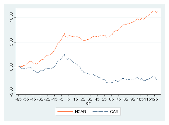 在做[-65,130]的事件窗口,估计窗口为1年的模型计算中,出来的CAR图趋势不一致是怎么回事呢?通常来说,两者应该趋势是一致的。图中,NCAR为市场调整模型估计出的CAR,CAR为市场模型估计出的CAR。