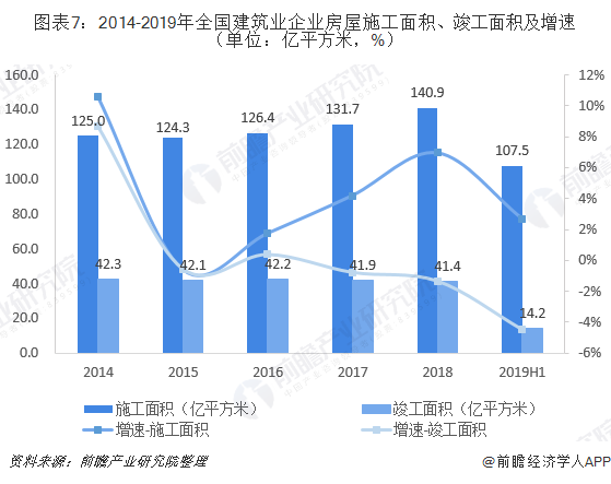 2019年以来,我国建筑业竣工面积连续三年下降,而施工面积虽依然保持增长,但增速已明显放缓。2019年上半年,全国建筑业企业房屋建筑施工面积107.5亿平方米,比上年同期增长2.71%。其中,新开工面积23.5亿平方米,比上年同期减少6.62%。房屋建筑竣工面积14.2亿平方米,比上年同期减少4.48%。