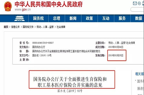 2019年3月月15日,国务院正式发布《关于全面推进生育保险和职工基本医疗保险合并实施的意见》(国办发〔2019〕10号),意见指出,2019年底前实现两项保险合并实施。