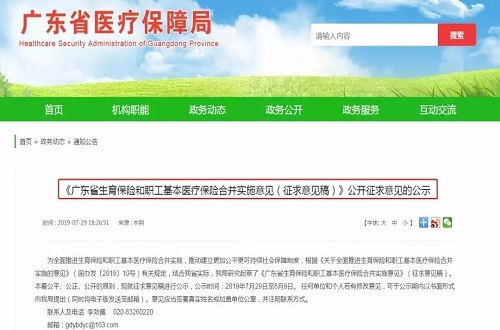 7月29日,广东省医疗保障局发布《广东省生育保险和职工医疗保险合并实施意见(征求意见稿)公开征求意见的公示》,公示指出:2019年年底广东省将实现,生育保险和基本医疗保险合并实施。