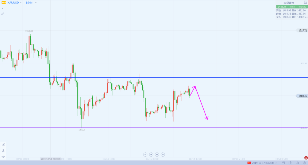 1:黄金1491-1492做空,损在1497,目标看向1470。