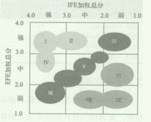 在IE矩阵的横坐标上,IFE加权评分数为1.0~1.99代表企业内部的劣势地位,2.0~2.99代表企业内部的中等地位,而3.0~4.0代表企业内部的优势地位。在纵坐标上,EFE加权分为1.0~1.99代表企业面临着较严重的外部威胁,而2.0~2.99代表企业面临中等的外部威胁,3.0~3.99代表企业能较好地把外部威胁的不利影响减少到最小程度。
