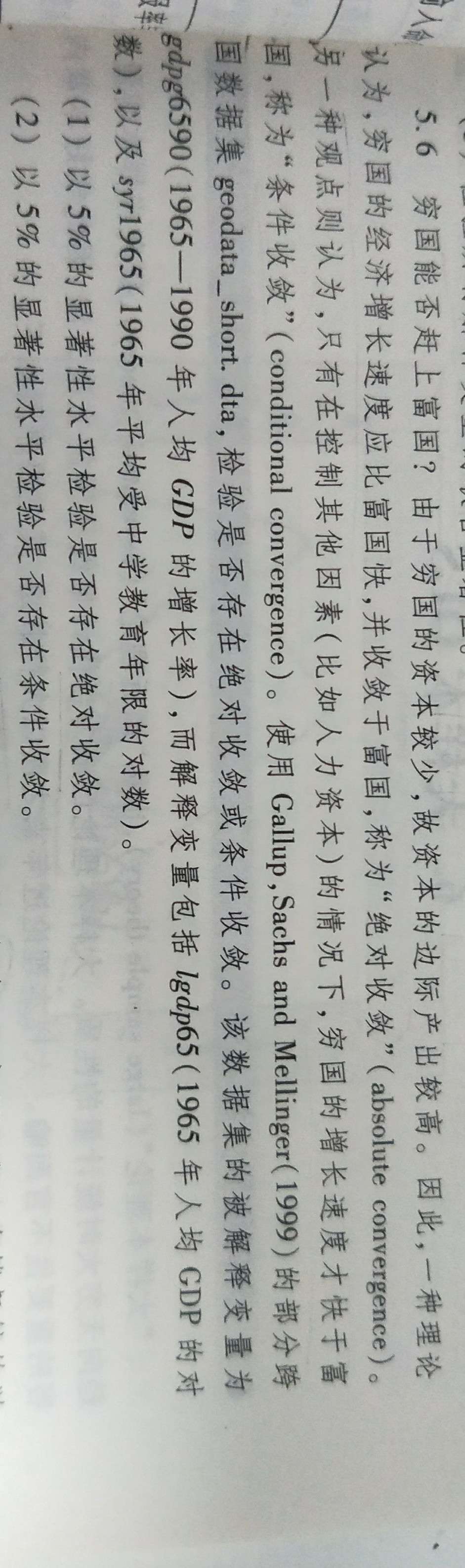 reg gdpg6590 lgdp65  ,lgdp65的系数不显著,因此不存在绝对收敛。