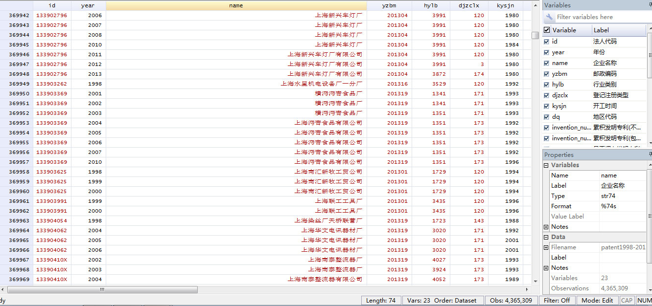 115861 发表于 2020-1-11 16:58 请教下几个问题: (1)2010年的累计发明专利(不包含终止专利)是空值吗? (2)工企库和专利库数据应 ...