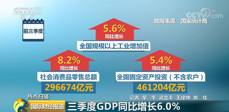 数据显示,前三季度,全国规模以上工业增加值同比增长5.6%,社会消费品零售总额296674亿元,同比增长8.2%,全国固定资产投资(不含农户)461204亿元,同比增长5.4%。