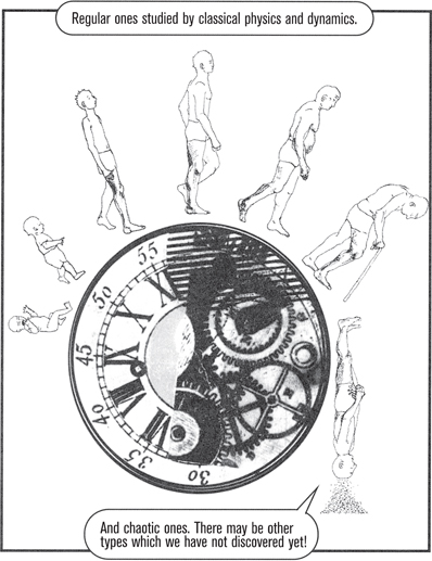 Behaviour that is unstable yet periodic is difficult to imagine – indeed, it appears to be a contradiction in terms.However, human history provides us with several examples of just such aphenomenon. It is possible to chart broad patterns in the rise and fall ofcivilizations. We can see that these patterns are periodic. But we know that events never actually repeat themselves exactly. In this realistic sense,history is aperiodic. We can also read in history textbooks that seemingly small unimportant events have led to long-lasting changes in the course of human affairs.