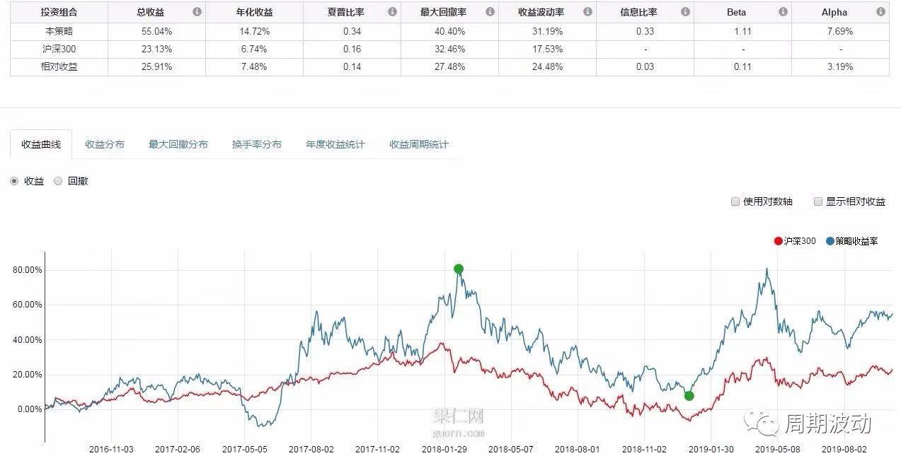 以超级品牌为股票池,选取现金收入比大于1.2的股票,并对满足指标条件的股票根据净资产收益率ROE进行排序,选择ROE最大的2支股票,持仓周期为30天,持仓时间为2016.08.01-2019.10.10,收益率曲线如下: