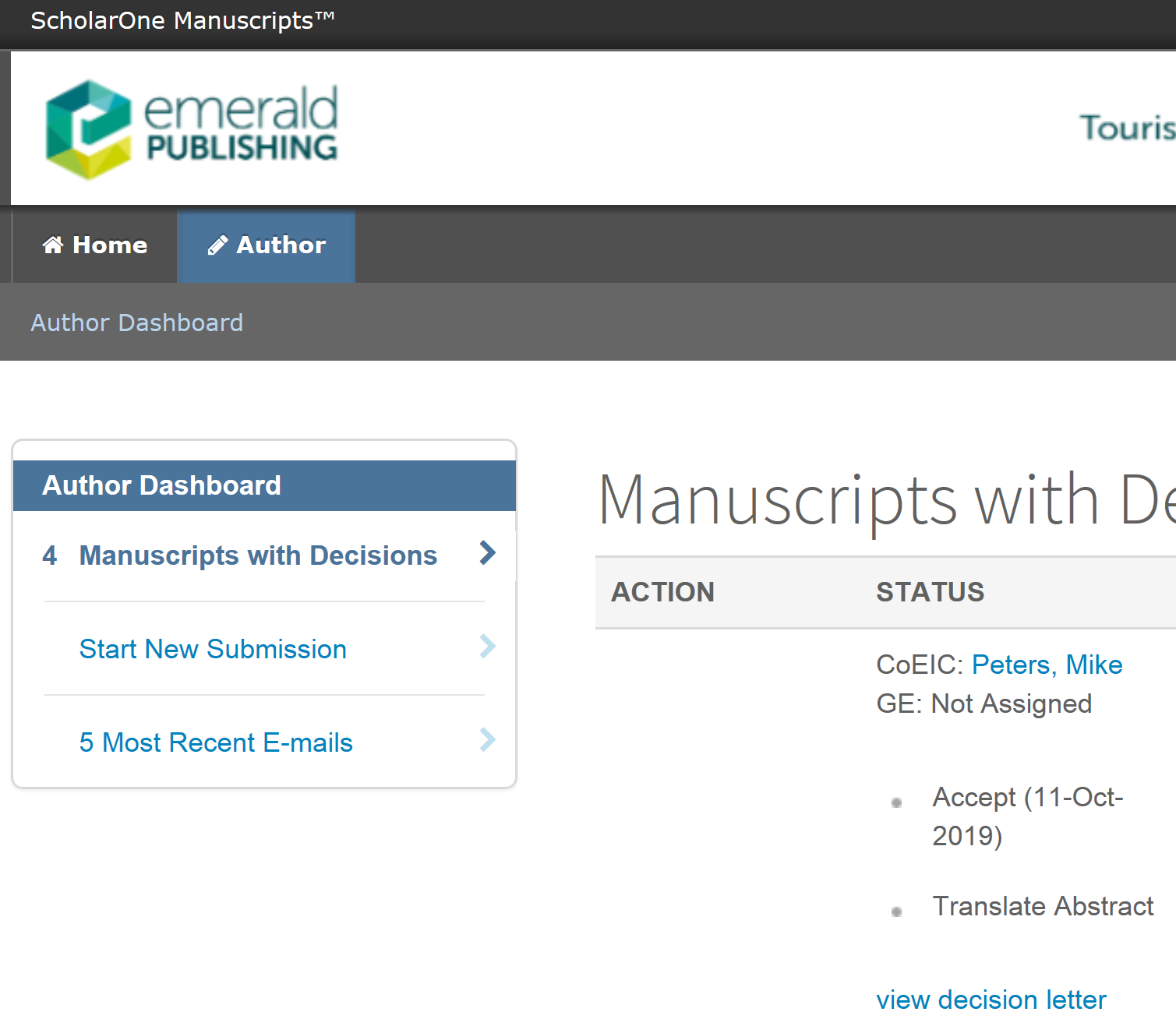 Please go to your Author Centre at https://mc.manuscriptcentral.com/tr (Manuscripts with Decisions for the submitting author or Manuscripts I have co-authored for all listed co-authors) to complete the Copyright Transfer Agreement form (CTA). We cannot publish your paper without this.All authors are requested to complete the form and to input their full contact details. If any of the contact information is incorrect you can update it by clicking on your name at the top right of the screen. Please note that this must be done prior to you submitting your CTA.)可是操作台里是空的,有没有那个大神发过emerald旗下期刊论文,第一次发它旗下的