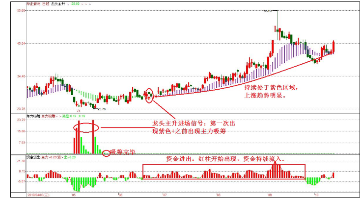 智能指标详解:龙头主升—先吸筹,后主升(紫色:代表中线上涨,第一个紫色信号通常是进场信号;绿色:代表空头下跌,第一个绿色信号通常是出场信号;配合:主力吸筹模型—一个月内有主力吸筹信号!)