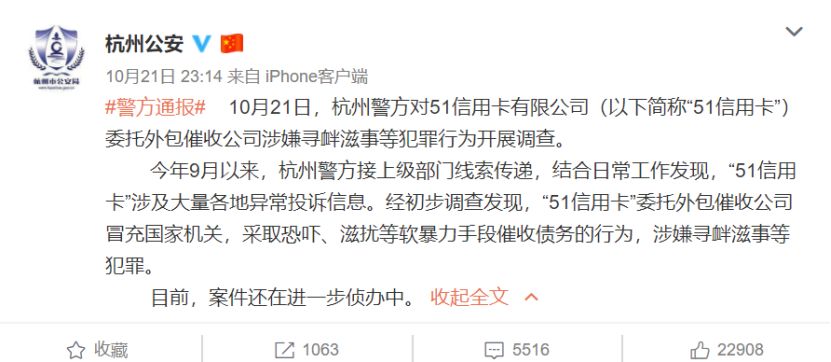 21日深夜,杭州警方通报,今年9月以来,杭州警方接上级部门线索传递,结合日常工作发现,“51信用卡”涉及大量各地异常投诉信息。经初步调查发现,“51信用卡”委托外包催收公司冒充国家机关,采取恐吓、滋扰等软暴力手段催收债务的行为,涉嫌寻衅滋事等犯罪。目前,案件还在进一步侦办中。
