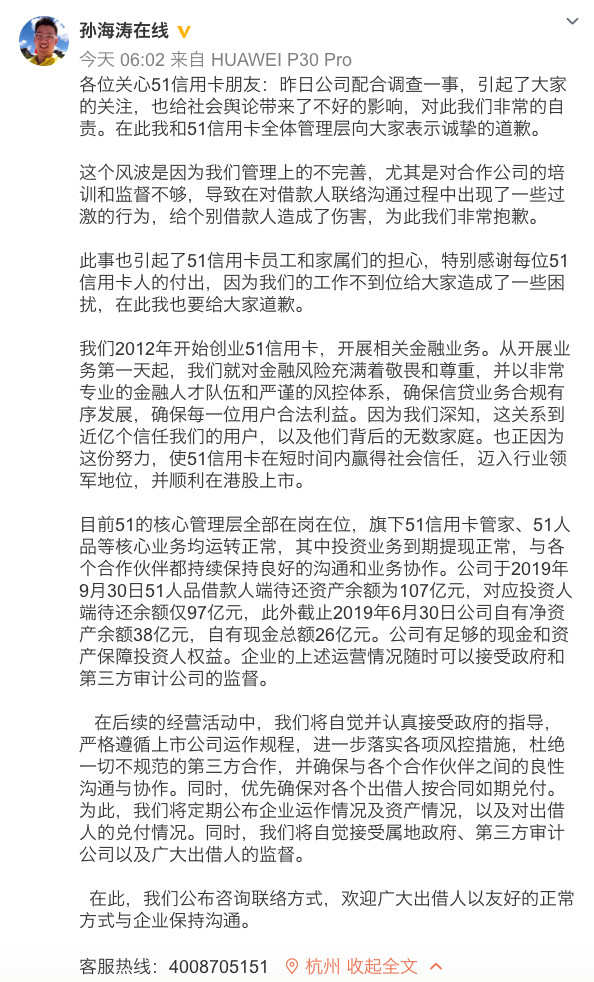 今天清晨(早上六点),51信用卡CEO孙海涛发布微博道歉,称管理上不完善,给个别借款人造成伤害。