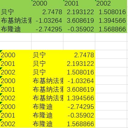 原始数据是横向的格式(绿色部分),请问有什么快速的方式转换成stata的面板数据格式(黄色部分),因为个体数量比较大,用excel手动整理工作量有点大,求助大声有没有快速的stata转换方法,或者matlab处理方式呀~~~感谢~~~