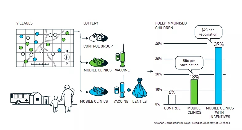 通过和当地村落的沟通,她后来发现,疫苗成本已经有效降低,但穷人仍不接种,往往是因为忙于其他事情,不觉得接种疫苗是个紧急的事情。随后,她挑选了120个村落进行随机对照试验。
