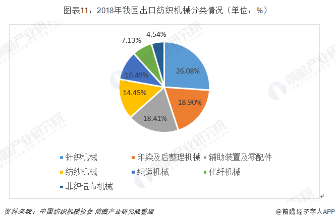 2018年,我国纺织机械出口36.66亿美元,其中针织机械出口额为9.56亿美元,占比26.08%,位居第一,其后依次为印染及后整理机械、辅助装置及零配件、纺纱机械、织造机械、化纤机械和非织造布机械,其中纺纱机械、织造机械和印染及后整理机械出口额分别占比14.45%、10.49%和18.90%,较上年分别增长27.24%、6.46%和4.20%。