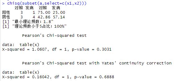 本人接触R时间不久,近期在做卡方检验的时候,发现R自带的计算方法太繁琐,比如想看最小理论频数,以及比例等都需要再输入命令,如果需要校正,还得再输入命令等,感觉挺不方便,以下为自制的function,可能写的不好,请大家批评指正: