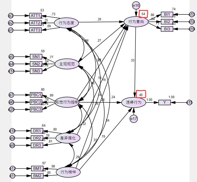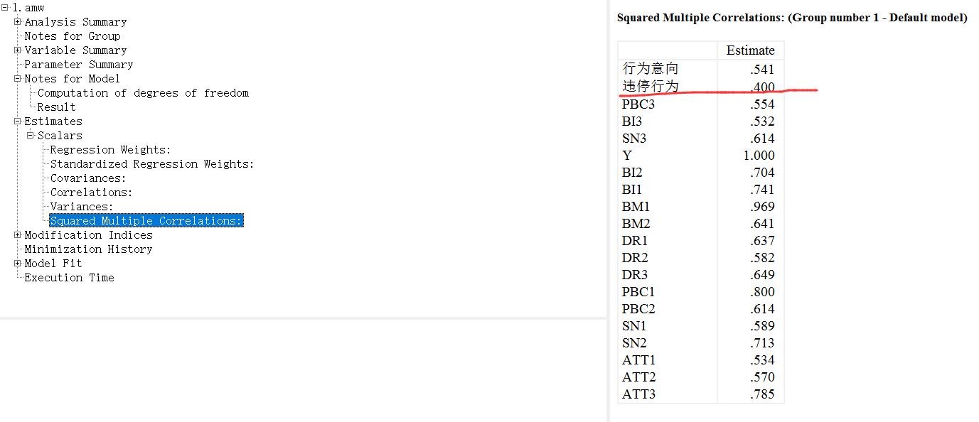 R方的一种计算是直接对标准化的回归系数(路径系数)进行平方,这种计算方法在观测变量对潜变量是成立的(如行为态度的三个观测变量ATT1-ATT3,我也验证过确实成立),但是潜变量对潜变量之间发现这种计算是对不上的,如下图所示,红色方框处为潜变量受其他潜变量影响的R方,如违停行为被知觉行为控制、行为意向和行为榜样这三个变量解释了0.4(40%)的方差,知觉行为控制、行为意向和行为榜样对违停行为的标准路径系数分别为0.262、0.331、0.187,这三个系数分别平方后相加约为0.21,并不等于0.4,所以请大神看一下,是哪里出了问题,如知道的,可私聊我,也有红包酬谢