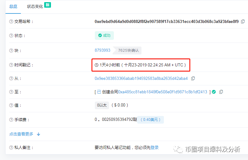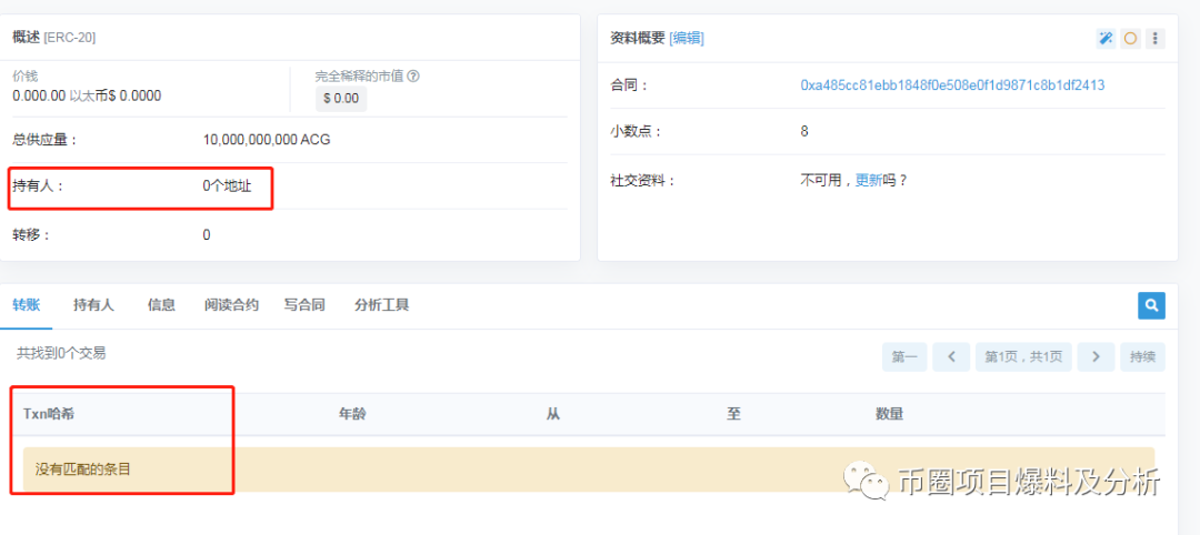通过有关渠道了解到ACG这个假项目发行了100亿枚代币,官方声称流通20亿枚。小编查询了该代币合约,发现该合约是2019年10月23日创建的,并且好像还没有创建成功,查不到哈希的匹配目录,代币持有地址也是为0。也就是说这个项目现在是没有代币合约的,更别谈发行总量100亿枚、流通20亿枚了。