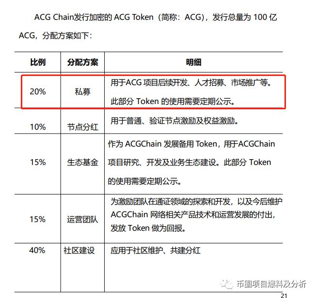 ACG总发行量10亿枚,20%用于私募,50%用于消费挖矿,20%用于团队建设,10%用于生态基金。