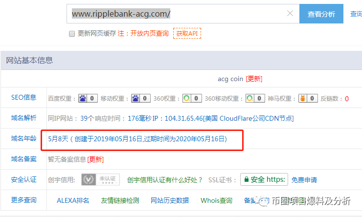 不论从项目的名字、介绍、用途、内盘、挖矿、发行总量、代币分配比列等基本都一样。小编查询了ACG官网域名(https://www.ripplebank-acg.com),该域名购买时间为2019年5月16日,购买时长1年。小编找的项目资料是2019年6月10日发表的。这么多的巧合应该就不是巧合了,在大量的资料面前可以表明它们是同一个项目方。小编找到的那个内盘项目现在好像已经跑路崩盘了,可以注册但无法下载APP(小编找到的项目和这个项目是不是一个项目方,大家应该可以判断出来,或者说那个项目跑了,回来又做了这个项目上交易所,官网的内盘信息没有改掉)
