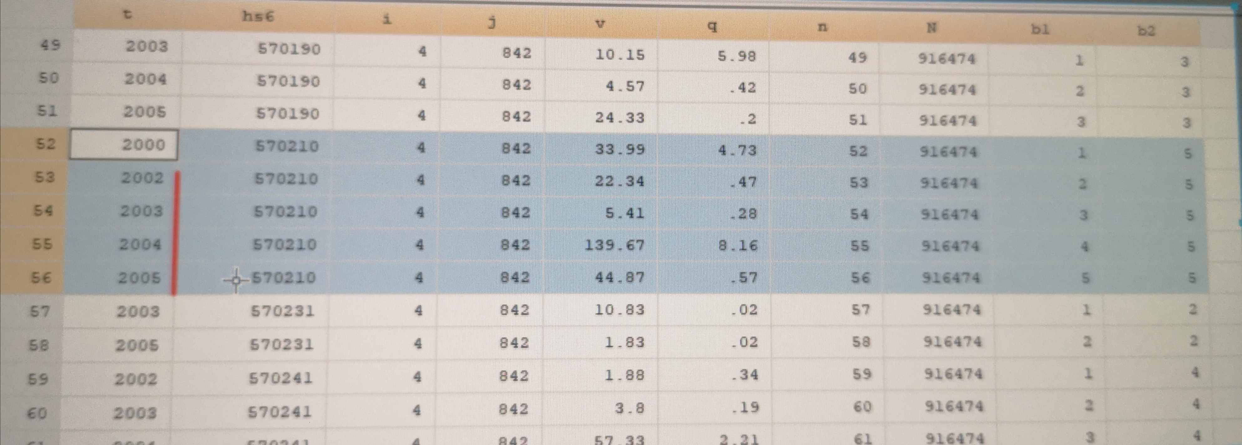 比如2004-2005国家4连续两年出口产品852910是一个连续时间段,2001-2005年国家8连续5年出口产品712910是一个连续时间段,2004年国家8出口产品71490是一个连续时间段,类似这样子,统计共有多少个连续时间段