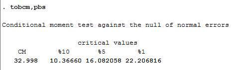 求助大神:请问tobit模型在检验样本正态性时,条件矩检验的统计量为32.998,有什么标准能看出有没有拒绝原假设?即是否服从正态分布。