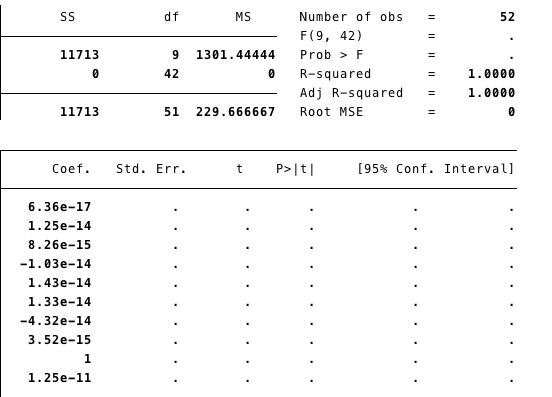 1. y对predictor varibles和时间趋势的多元回归,结果是y几乎全部被时间趋势解释了(倒数第二个是时间趋势),这样是不是说明要取对数进行回归?