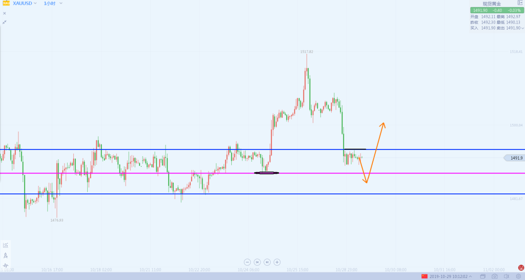 黄金如图,小时K中倒V的形态的确不利于上涨,但是日K已经走平,大周期在等待小周期的调整到位,只有打破1480整体框架才会重新改变,然而1小时中的压制状态更加倾向先行向下发力之后才有上升的机会,若白天先向上反抽直接上涨的概率并不大,空头的压制没有发力,反而是做空的机会,而若先向下发力或得支撑之后才能更好的上涨,所以操作上若黄金下走下探1488-1487接多,防守在1482拐点位置,上方看向1500。