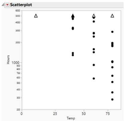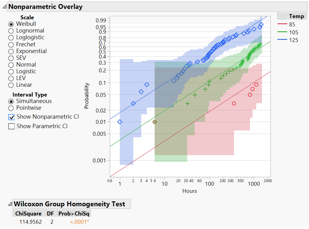正常条件下,产品出现失效的机率很低,所以经由一些条件的设置如环境加速产品失效的机率,常见加速因子包含温度、电压、压力等,平台中也包含数据的转换,常见对温度进行Arrhenius转换,也包含线性、对数、倒数、平方根等等的转换。JMP提供了专属的可靠性试验设计的平台来设计加速因子对寿命的试验。 检测不同温度下各组间是否存在差异