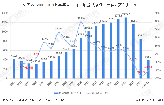 从白酒销量来看,销量变化特征与产量基本一致,但在2019年上半年,中国白酒销量继续大幅下滑,同比减少了20.7%,主要原因是国内经济发展放缓,导致白酒消费疲软。