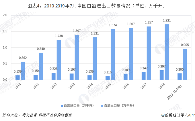 从白酒产量来看,2011-2018年,中国白酒年产量总体有显著增长。2005年,中国白酒行业一转过去产量下降态势;2005-2016年,中国白酒产量逐年递增,就此迎来了白酒行业的“黄金十二年”;2016年白酒产量达到1358.4万千升,达到了历史峰值。2017年,由于受白酒质量安全事故、ZF严加惩治政治贪腐以及多项禁酒令的影响,白酒行业产量出现负增长;进入2018年后,白酒产量延续上一年低迷态势,白酒产量约871.2万千升,同比减少27.2%。2019年上半年,中国白酒产量同比小幅回升,增长了2.2%。