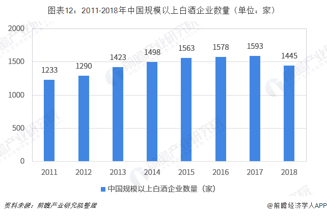 从白酒企业来看,近两年在白酒产量大幅下降的背景下,也加剧了白酒行业的“马太效应”,上市酒企等知名企业的竞争力越来越强,而中小酒企经营困难,甚至停产,而被市场所淘汰。从白酒规模以上企业来看,2018年中国规模以上白酒企业数量为1445家,较2017年有明显减少。