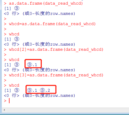 数据框是空的,0行,你看到的是列名,列名不能重复,所以加标识以便区别。