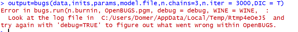 运行到上面那一步就出错了,后面的代码都没有运行,这个可能跟openbugs的存放路径有关吧,但是我也不太清楚