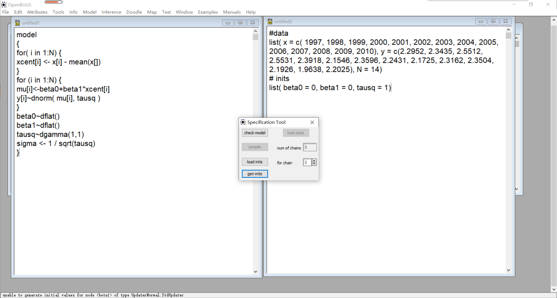 请问openbugs大神,我这代码是照着书上打的,但是一直错不知道为什么