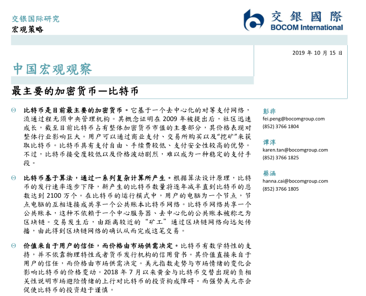 比特币是目前最主要的加密货币。它基于一个去中心化的对等支付网络,流通过程无须中央管理机构。其概念证明在 2009 年被提出后,社区迅速成长,截至目前比特币占有整体加密货币市值的主要部分,其价格表现对整体行业影响巨大。用户可以通过商业支付、交易所购买以及“挖矿”来获取比特币。比特币具有支付自由、手续费较低、支付安全性较高的优势。不过,比特币接受度较低以及价格波动剧烈,难以成为一种稳定的支付手段。