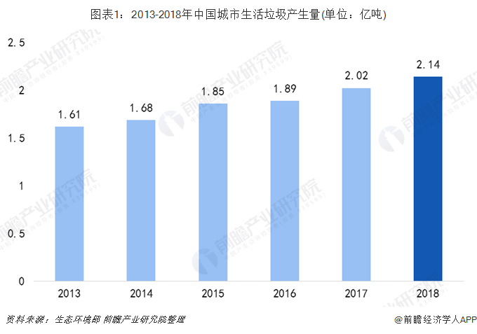 根据生态环境部2018年12月公布的《2018年全国大、中城市固体废物污染环境防治年报》,2017年,202个大、中城市生活垃圾产生量为2.02亿吨,较2016年均有所提高。2013-2017年,我国城市生活垃圾产生量的复合增长率为5.75%,前瞻推算,2018年,我国城市生活垃圾产生量约为2.14亿吨左右。