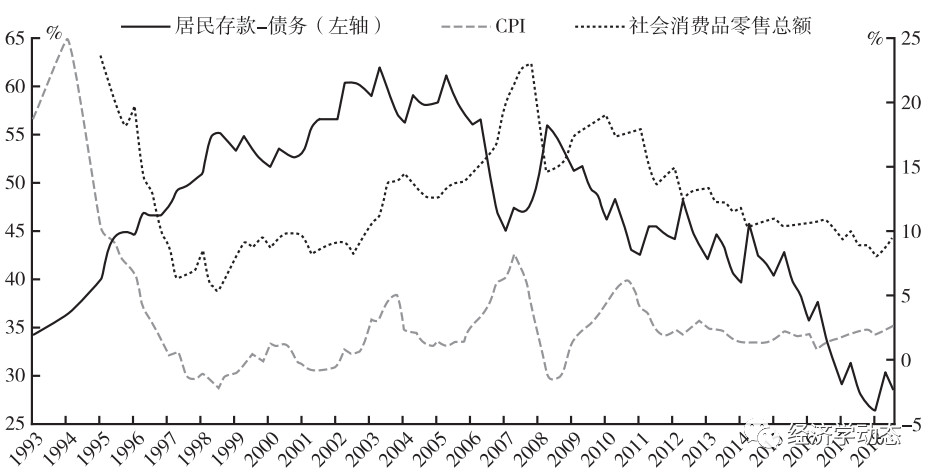 改革开放以来,中国居民的收入水平和财富结构发生了巨大变化。一方面,这些变化反映了长期停滞说的核心内涵,即外部因素降低总需求;另一方面,居民资产负债表的规模扩张和结构变化,也使得金融周期对实体经济的影响越来越大。如图4所示,我国居民储蓄存款减去居民债务这个指标可以用来简单刻画居民部门的流动性状况,类似企业的营运资本。占GDP的比重在2003—2006年达到60%的高点,此后开始一路下滑,目前已经低于30%。其原因是,居民储蓄存款占GDP的比重长期稳定在80%,而居民部门债务占GDP的比重已经从20%左右迅速上升到目前的50% (图1)。这意味着在居民部门资产负债表的扩张过程中,资产方流动性最高的存款相对没有增长,快速增长的是其他高收益金融资产和房地产。与此相对应,负债方居民债务也迅速扩张。这种变化,一方面使整个居民部门的流动性下降,另一方面则导致利息支出上升,使一些购房者还债压力增大。在这个过程中,消费品零售总额的同比增速一路下滑,CPI也逐步进入低波动阶段。在我国经济发展的这一阶段,一个结构性特征就是金融和房地产对居民部门资产负债表的重构,对消费需求产生了抑制。
