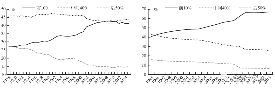 图5数据来自法国经济学家皮凯蒂团队的研究 (Piketty et al,2019)。他们指出,1978—2015年,中国的人均国民收入增长了9倍多,美国只增长了59%。无论在中国还是美国,底层50%家庭的增长都小于平均增长,而顶层的增长要高于平均增长。中美之间的关键区别在于,在中国底层50%也从增长中受益,在美国底层50%则一无所获。1978—2015年,中国底层50%平均收入实际增长5倍以上,虽低于平均水平,但仍非常可观。相比之下,美国底层50%平均收入在此期间增长率为负。中国的这种增长可能使日益加剧的不平等现象更能为人们所接受。但是,如果未来绝对经济增长下滑,那么分配问题的回旋空间就会急剧收缩。