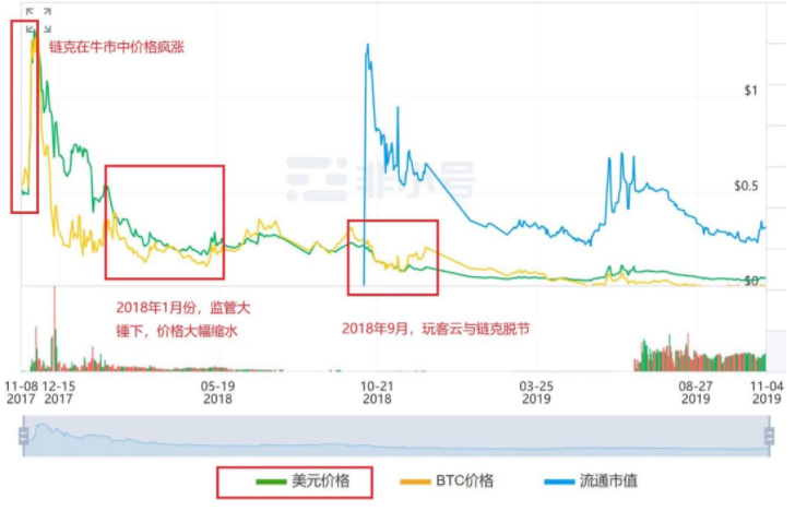 迅雷的主动“脱币”虽然让其甩掉了合规的包袱和对那些高位接盘链克和玩客云的用户的责任,但是在监管打击和“玩客云与链克”脱节的双重作用下,链克、玩客云、迅雷股票价格纷纷开启恶性下行通道,连带着迅雷的另一产品“星域云”也受到影响。2018年底,链克的价格从5元以上下挫到不到1元。官网售价599的玩客云在某电商平台上以271元的价格进行促销,二手市场上,价格甚至低至80元/台。