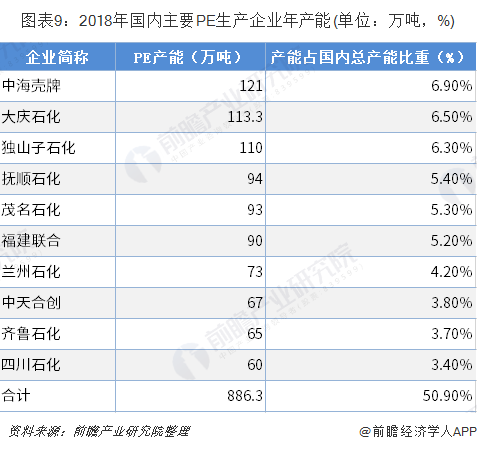 根据卓创资讯统计数据,2018年中国PE在产的企业有36家,包括中海壳牌、大庆石化、独山子石化、抚顺石化、茂名石化等企业,PE产能前十企业占国内总产能的50.9%,整体市场集中度较高。
