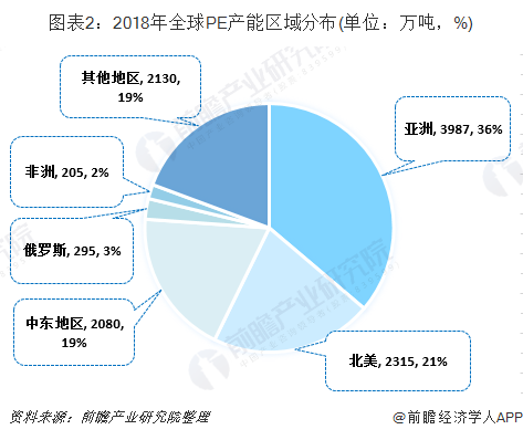 从区域产能分布来看,PE产能主要分布在亚洲和北美地区,2018年亚洲和北美地区PE产能分别为3987万吨和2315万吨,分别占全球的36%和21%。