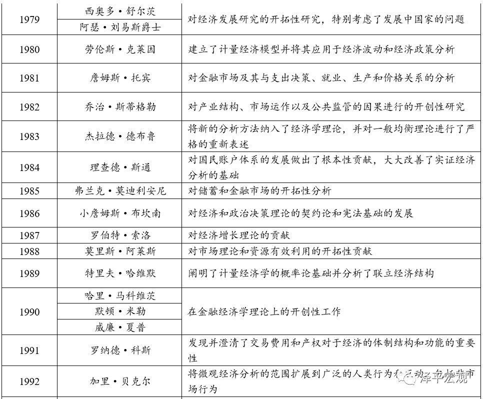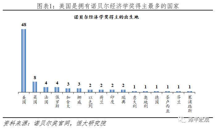 诺贝尔经济学奖的全称是“瑞典中央银行纪念阿尔弗雷德·诺贝尔经济学奖”,由瑞典中央银行于1968年其成立300周年之际设立,以表彰为经济学发展作出杰出贡献的学者。1969年首次颁奖,至今共计颁奖51届,获奖84人。诺贝尔经济学奖是经济学领域的最高荣誉,获奖者的理论贡献对学术界、商业界和政策界均产生了重大影响。例如,涉及经济增长的教科书无法绕开罗伯特·索洛(1987年获奖)和保罗·罗默(2018年获奖)的增长模型,资本市场中的衍生品交易离不开罗伯特·默顿和迈伦·斯科尔斯(1997年获奖)的B-S期权定价公式,各国中央银行的货币政策制定也深受米尔顿·弗里德曼(1976年获奖)货币理论的影响。1.1 关于诺贝尔经济学奖的统计1)1969-2019年,共计51届84位获奖者中,有25届由一位得主独享,有19届由两位得主共享,有7届由三位得主分享。2)最年轻的得主是2019年获奖的埃丝特·迪弗洛,时年46岁;最年长的得主是2007年获奖的莱昂尼德·赫维奇,时年90岁。3)有两位女性得主,第一位是2009年获奖的埃莉诺·奥斯特罗姆,第二位是2019年获奖的埃丝特·迪弗洛。4)有四位得主,他们的家人也获过诺奖:1969年获奖的简·丁伯根,弟弟尼古拉斯·丁伯根获得1973年的生理学或医学奖;1974年获奖的纲纳·缪达尔,妻子阿尔瓦·缪达尔获得1982年的和平奖;2019年获奖的阿比吉特·班纳吉和埃丝特·迪弗洛,二人是夫妻。5)按照得主的出生地进行统计,美国是拥有得主最多的国家,共计48位,其次是英国,共计8位。若根据得主的求学经历、任职机构和现有国籍进行统计,美国的得主人数将会更高,例如2019年获奖的阿比吉特·班纳吉和埃丝特·迪弗洛,分别出生于印度和法国,但是分别在哈佛大学和麻省理工学院获得博士学位,现均就职于麻省理工学院。美国培养了最多最优秀的经济学人才,在经济学研究领域处于中心地位。
