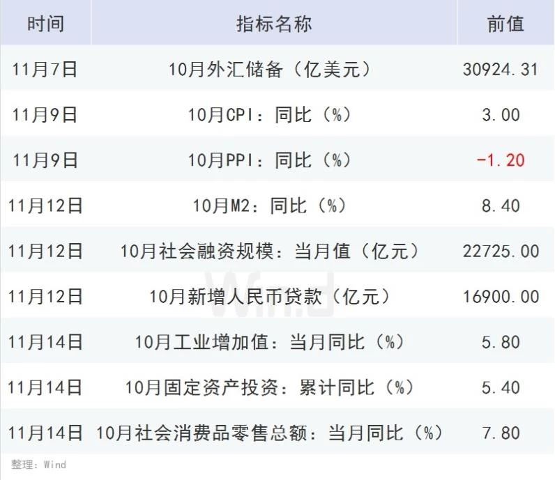 11月7日(本周四)开始,10月宏观数据将陆续公布。