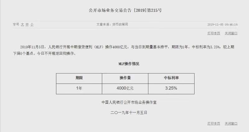 11月5日,央行公告称,当日人民银行开展中期借贷便利(MLF)操作4000亿元,与当日到期量基本持平,期限为1年,中标利率为3.25%,较上期下降5个基点。这是MLF利率自2018年3月后的首次调整。