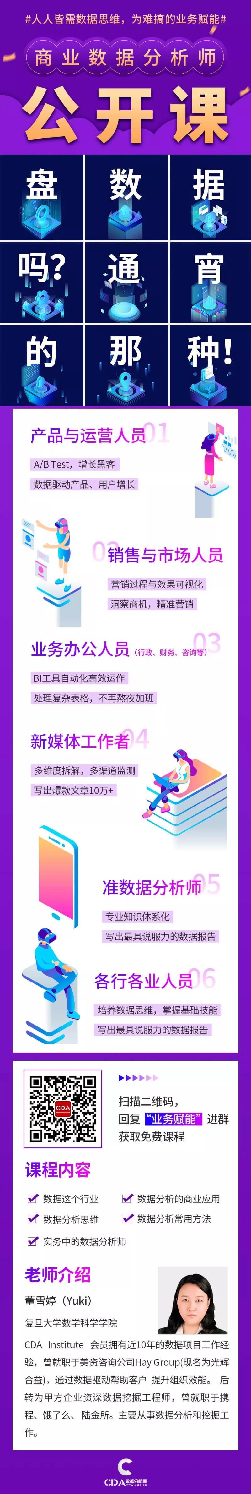 这不是一门贩卖焦虑的课,而是一套普及数据分析知识构架和体系技能的养成计划(免费)。大数据、AI如同20年前的互联网,从陌生到与我们紧密相连,最终成为了我们自身的一部分。90%以上的雇主都希望员工具备数据感知与解读的能力,逻辑思维、量化思维、数据思维,已成为让我们更好生活的普适能力。对于职场人士,学会基本的数据分析技能,能够: