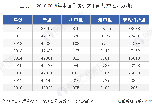 我国焦化行业经过几年的调整分化、优胜劣汰,供需总体保持平衡,市场运行逐步规范。2018年国内焦炭供需状况总体稳定。全国焦炭产量累计为4.38亿吨,同比增长0.8%,其中钢铁焦化联合企业为1.11亿吨,同比增长0.4%,其他焦化企业为3.27亿吨,同比增长0.9%。焦炭表观消费量4.29亿吨,2010年至2018年间,年均增长率为2.7%。