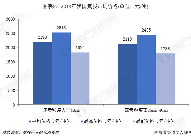 2017年以来,我国焦炭价格高位震荡,截至2017年末,山西临汾一级冶金焦价格为2400元/吨,仍维持较高水平。到了2018年,国内焦炭市场总体上呈现先抑后扬整体震荡上涨态势。一季度与往年最大的区别在于有采暖季限产,使得下游需求不足。2月份由于极端天气影响运输加上春节假期,支撑了焦炭现货价格的上涨。3月份下游需求未如期释放,焦炭现货价格随之大幅下调。从5月份起,焦炭价格扭转了连续下跌的局面,出现反弹并震荡上行,开启了连续八轮提涨,涨幅达650元/吨。由于限产的力度不断加大,以及高炉产能利用率持续回升,造成的焦炭缺口对支撑焦炭价格上涨起到了关键作用。2018年焦炭粒度大于40mm的平均价格为2190元/吨,平均价格最高为2516元/吨,最低为1824元/吨;焦炭粒度在25mm-40mm的平均价格为2119元/吨,最高为2435元/吨,最低为1786元/吨。