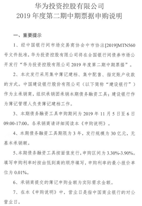 根据11月4日发布的华为投资控股有限公司2019年度第二期中期票据申购说明,本期债务融资工具期限为3年,发行规模为30亿元,申购期间为2019年11月5日至6日09:00—17:00。